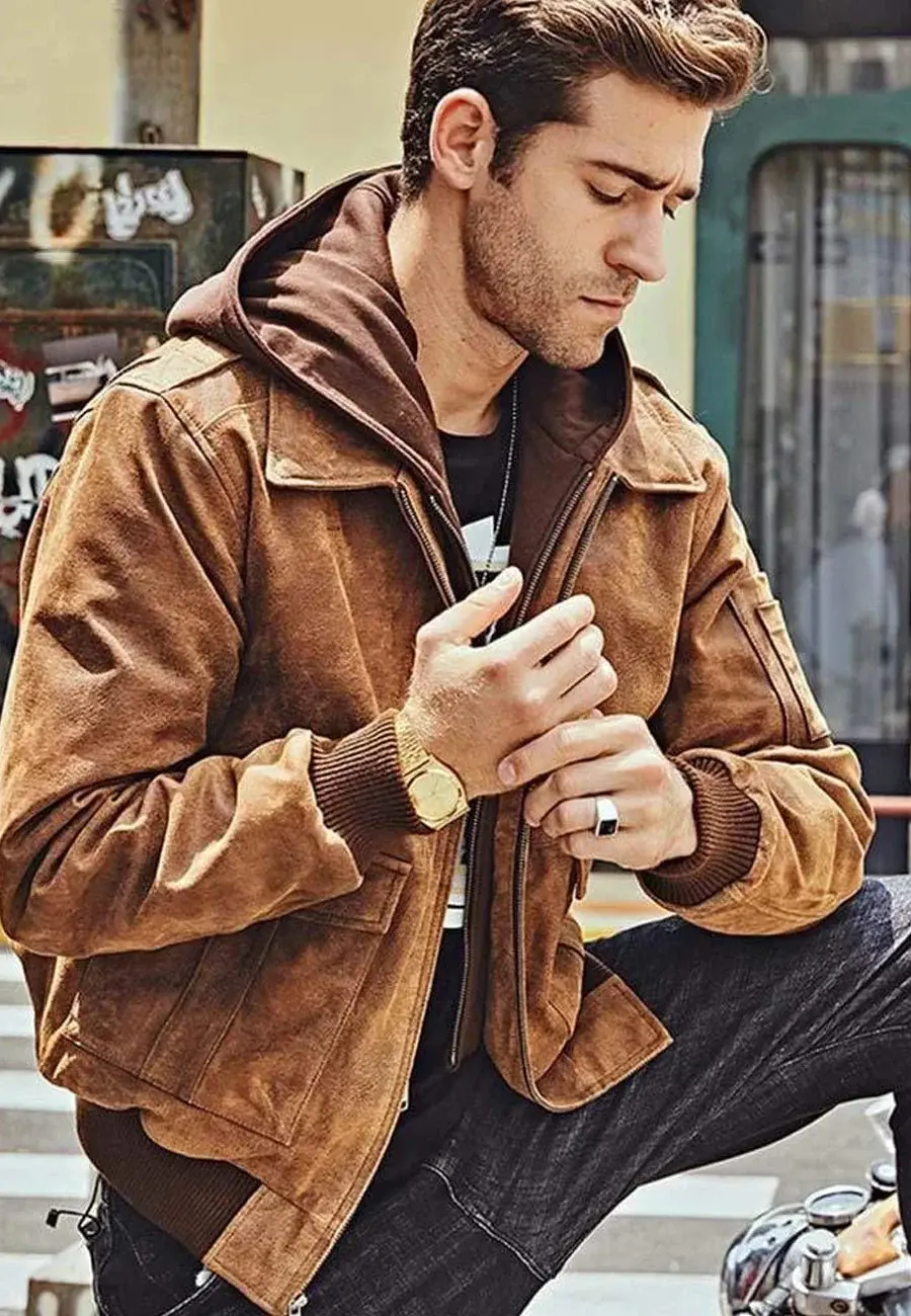 The Ultimate Men’s Brown Sheepskin Leather Hooded Bomber Jacket – Timeless, Warm & Boldly Stylish! Step up your winter fashion game with this men’s brown sheepskin leather bomber jacket with a hood—crafted for the modern man who demands rugged style, unmatched comfort, and durability. Made from 100% genuine distressed sheepskin leather, this vintage bomber jacket delivers an effortlessly masculine and confident look, whether you're hitting the streets or layering up for the cold.