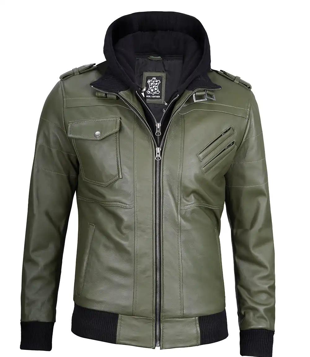 Turn heads in this badass men’s green leather hooded jacket made from 100% real leather. Featuring a removable fleece hoodie, rugged detailing, and winter-ready warmth — it’s built to perform, styled to stun. Order now and own the streets – limited stock!