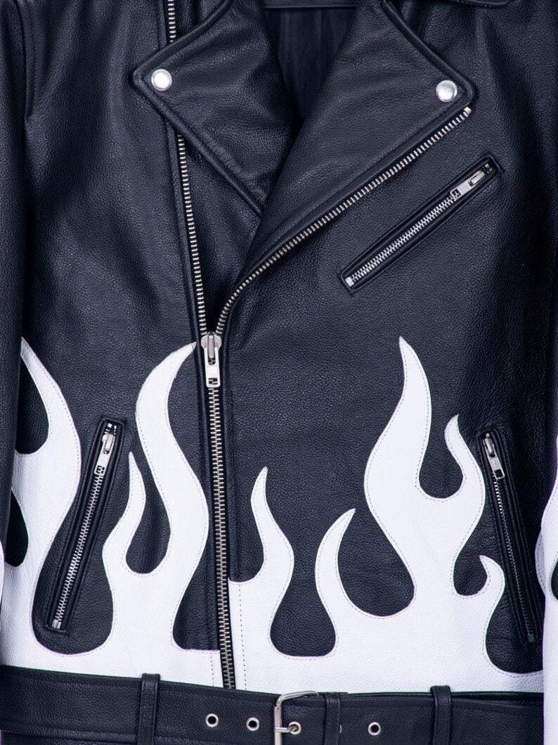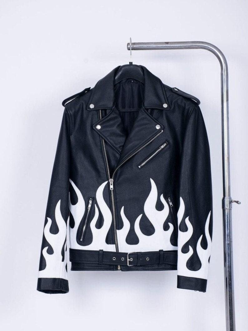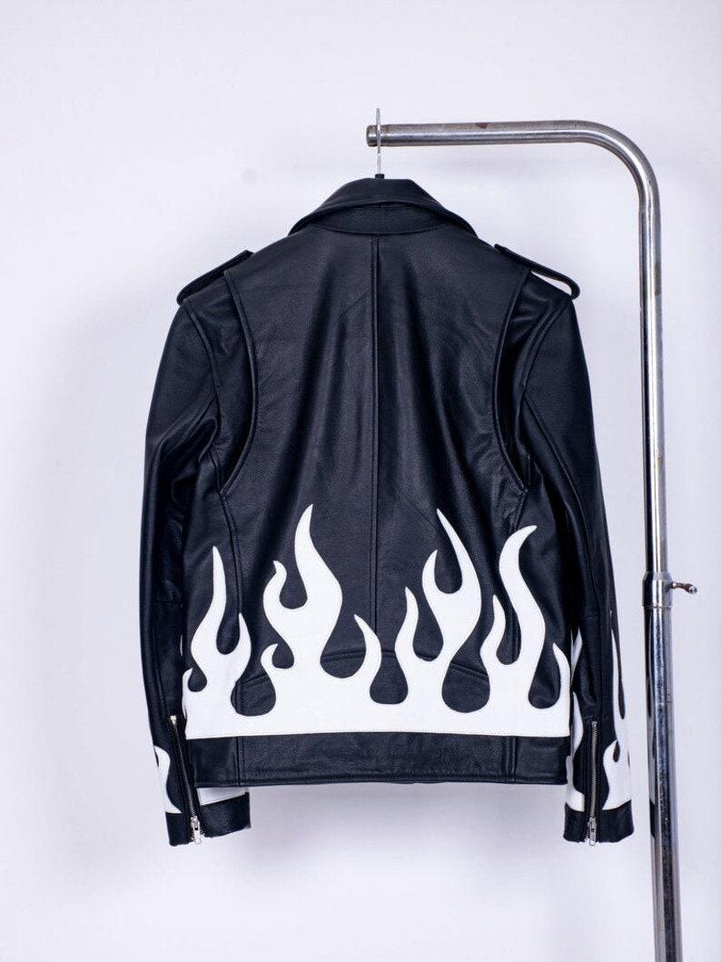 Turn up the heat in this white flame lambskin leather jacket! Perfect for bold men who ride, rule, and slay. Limited stock – ignite your look now!
